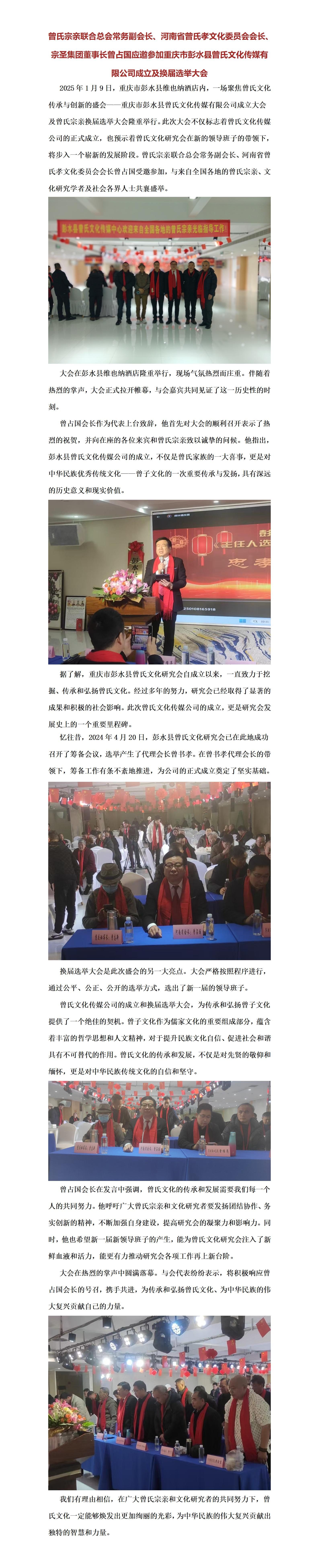 曾氏宗親聯(lián)合總會(huì)常務(wù)副會(huì)長(zhǎng)、河南省曾氏孝文化委員會(huì)會(huì)長(zhǎng)、宗圣集團(tuán)董事長(zhǎng)曾占國(guó)應(yīng)邀參加重慶市彭水縣曾氏文化傳媒有限公司成立及換屆選舉大會(huì)